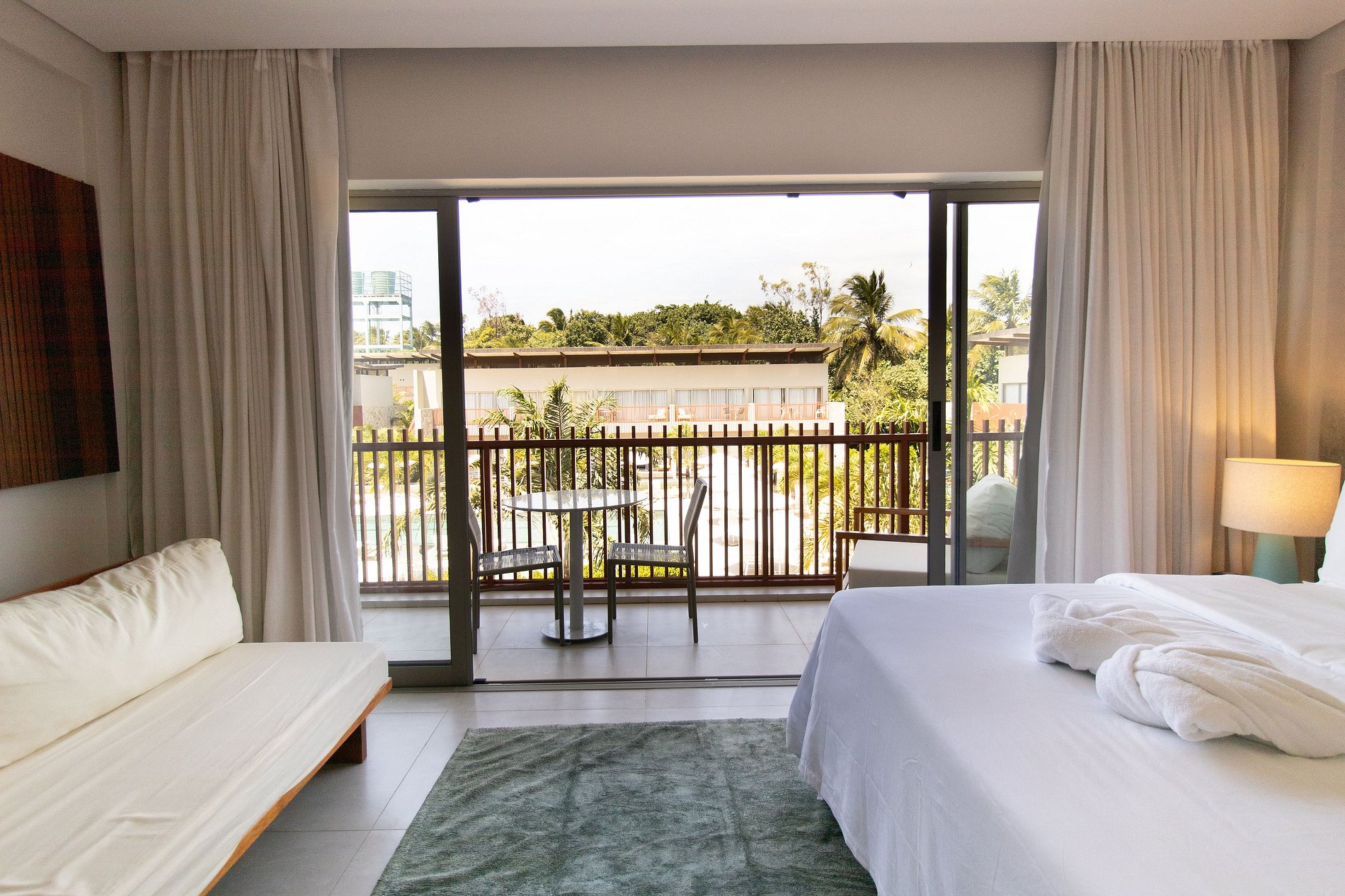 O quarto, decorado com tons suaves e mobília contemporânea, inclui uma confortável cama king-size completa com um enxoval de alto padrão, oferecendo o máximo em aconchego. A varanda é equipada com uma mesa e cadeiras, perfeitas para desfrutar de um café da manhã ao ar livre ou relaxar admirando a piscina.