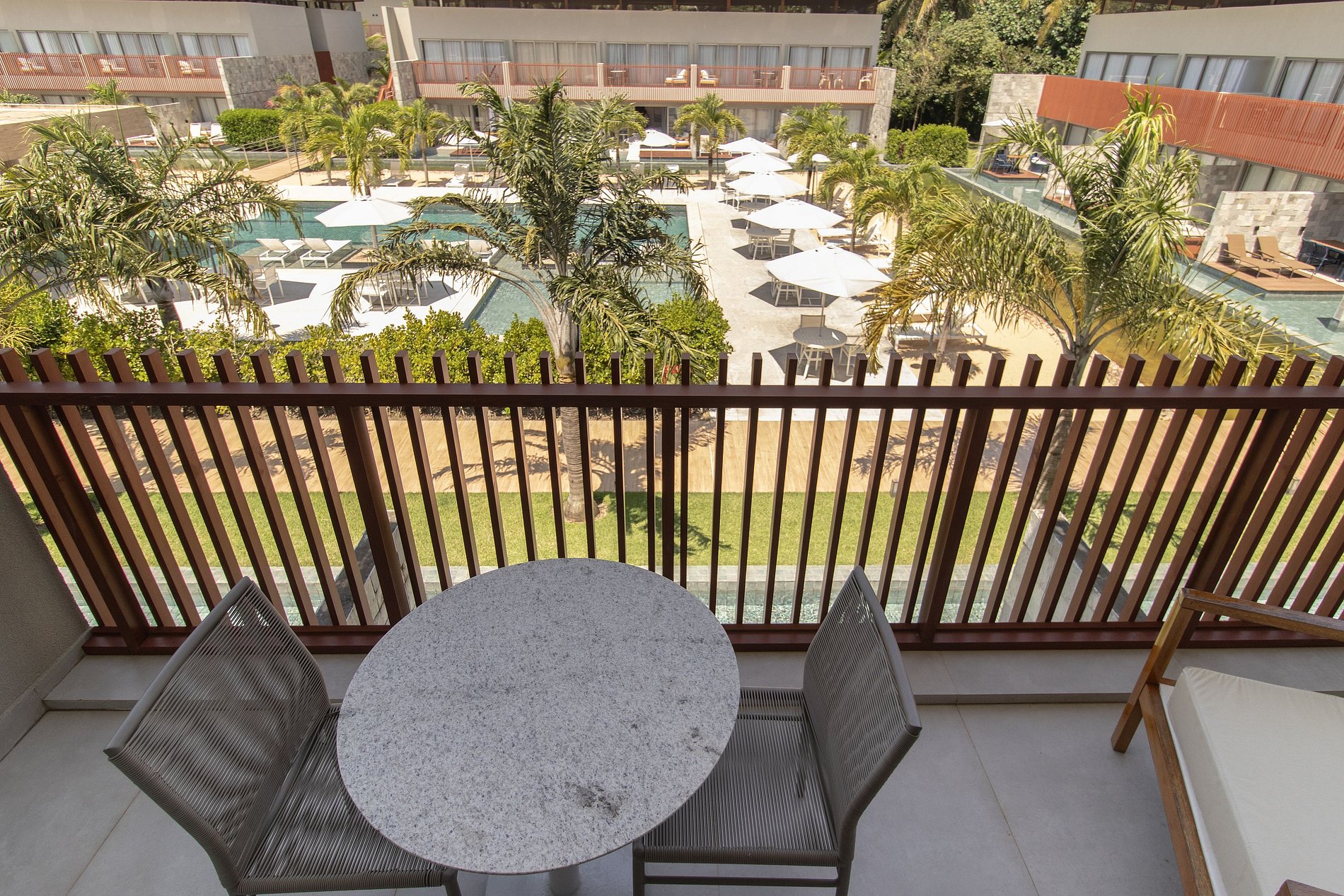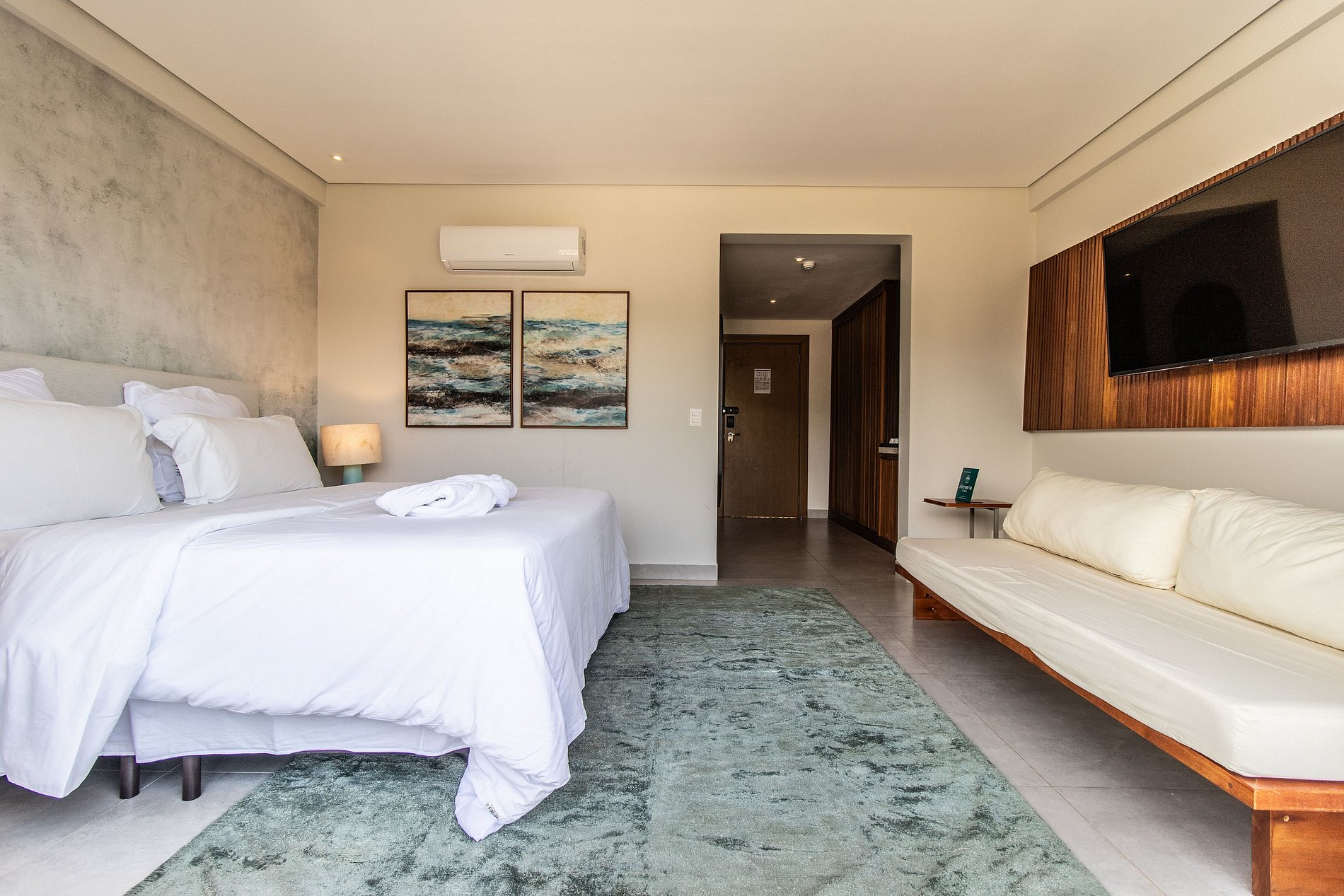 O quarto, decorado com tons suaves e mobília contemporânea, inclui uma confortável cama king-size completa com um enxoval de alto padrão, oferecendo o máximo em aconchego. A varanda é equipada com uma mesa e cadeiras, perfeitas para desfrutar de um café da manhã ao ar livre ou relaxar admirando a piscina.