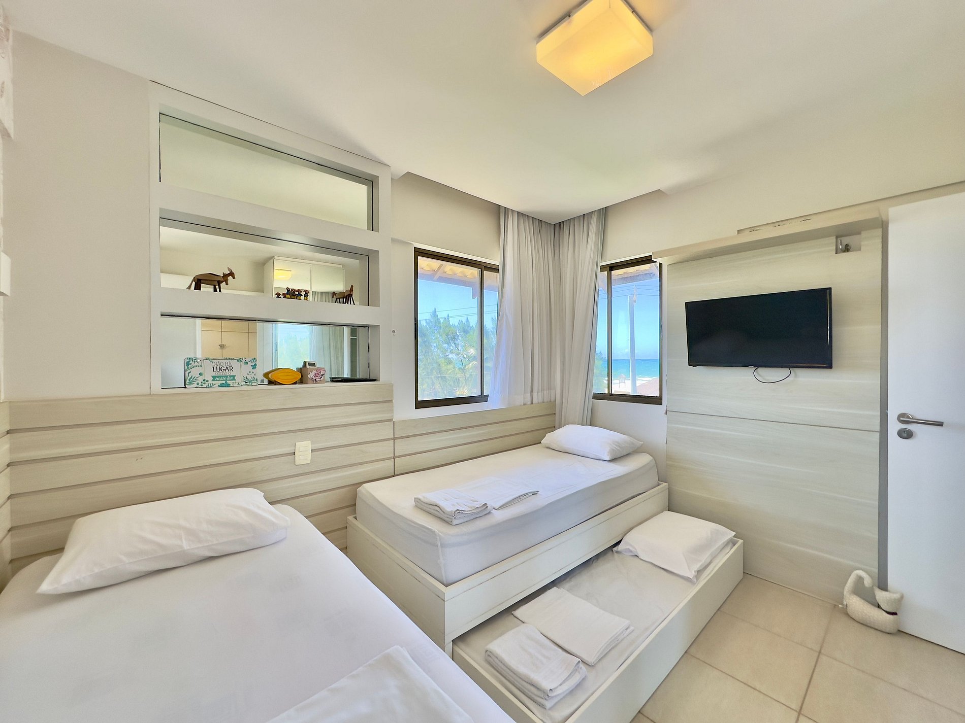 Essa cobertura maravilhosa, tem três suítes! Uma com uma cama para o casal e duas com duas camas de solteiro, todas com ar condicionado e vista para o mar. Ou seja, dá pra aproveitar com todo mundo!