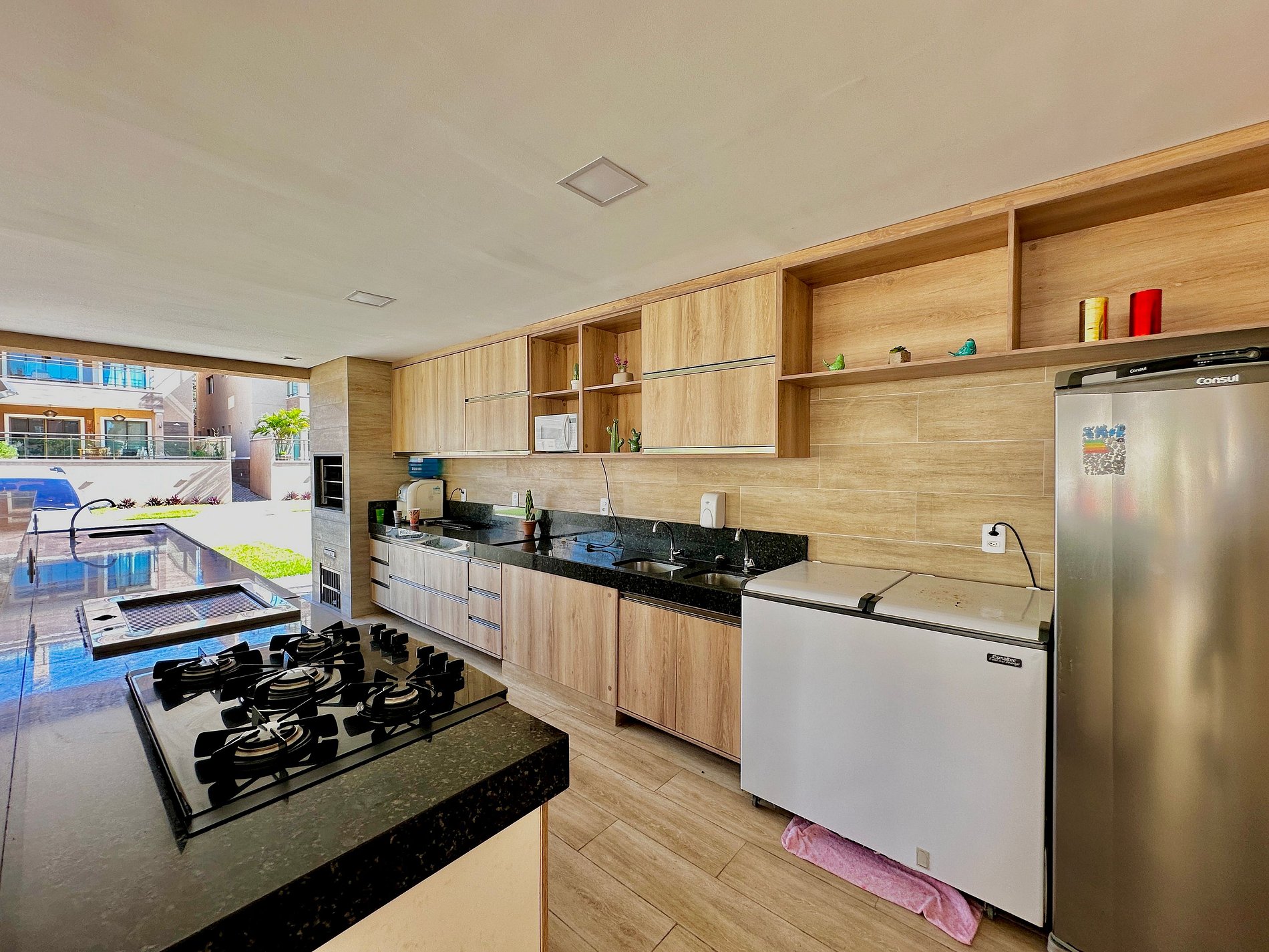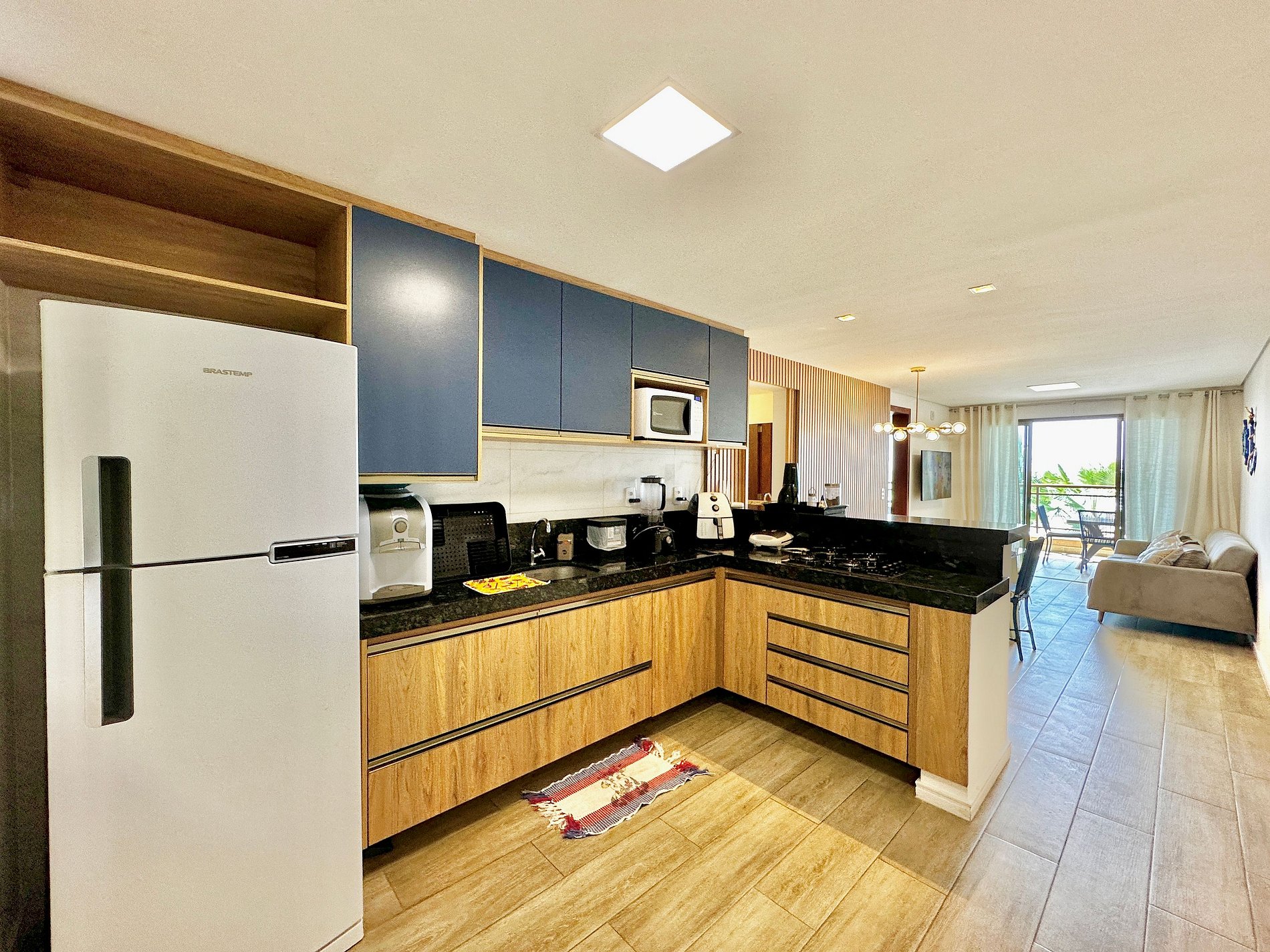 - Cozinha completa estilo americana com diversos eletrodomésticos essenciais como Air Fryer