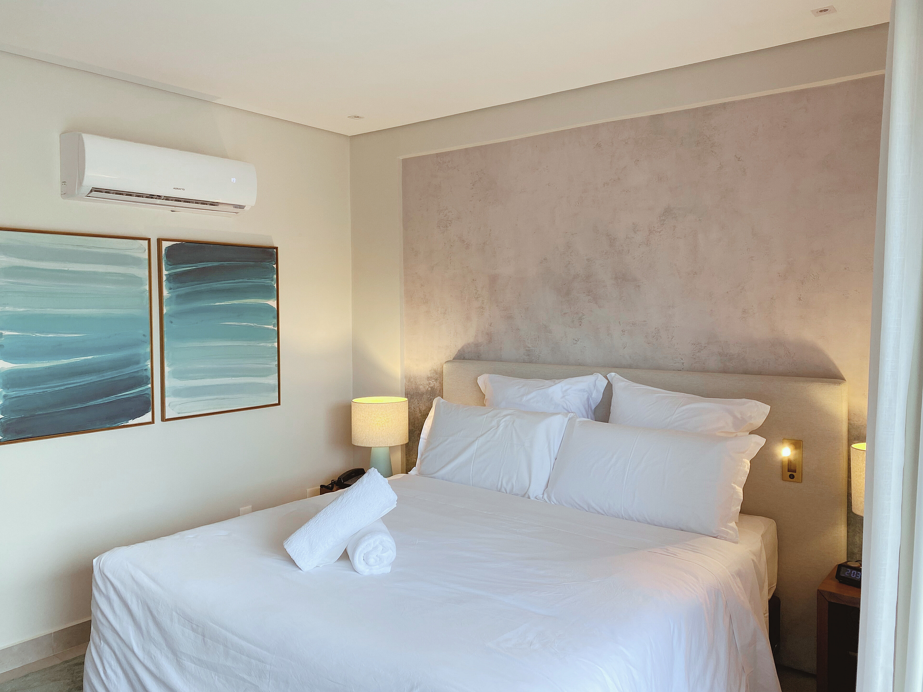 Ar condicionado na lateral da cama é péssimo. Deveriam passar para local sobre a cabeceira ou instalar desviador de fluxo de ar. Não dispunha de toalhas de rosto nem toalha para piso do banheiro.