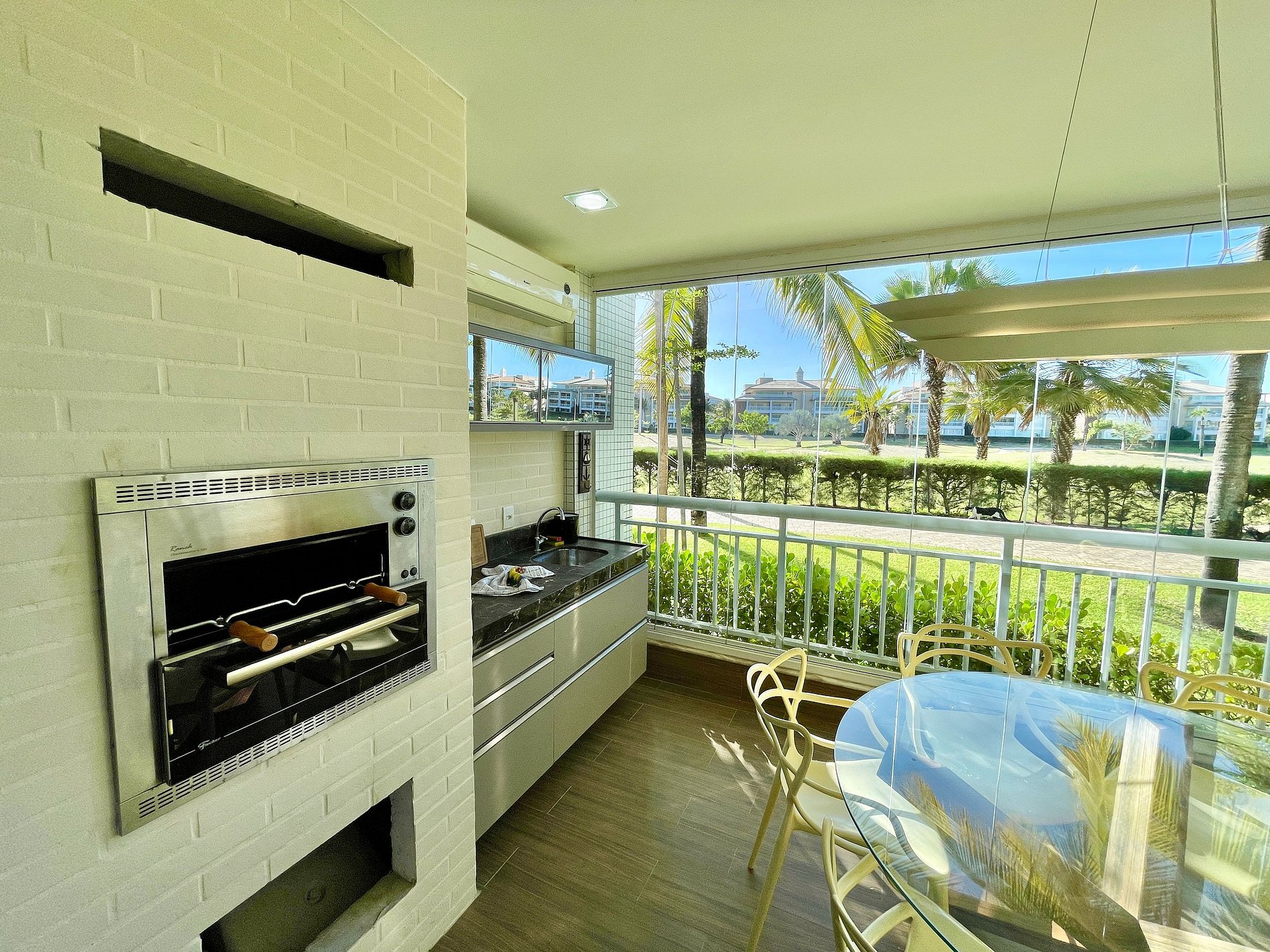 > Varanda equipada com churrasqueira, mesa de jantar e vista incrível