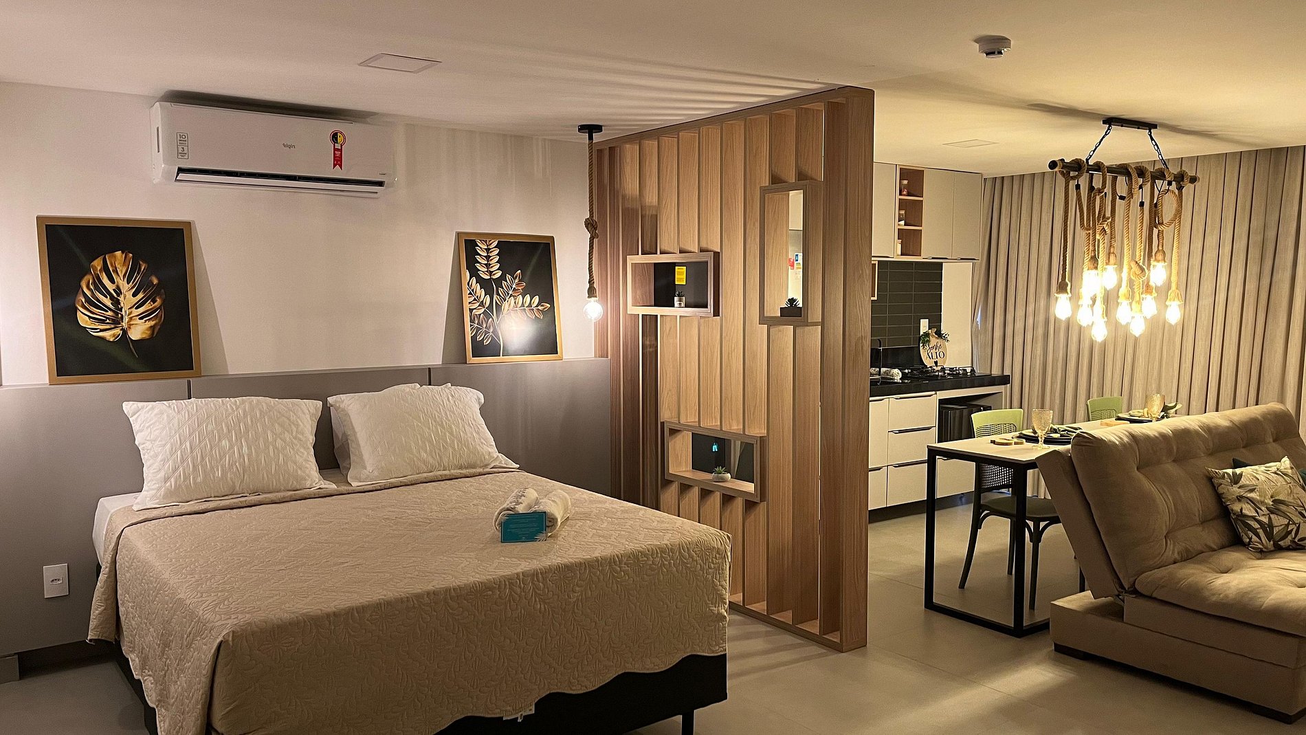 O design estiloso do flat é aprimorado por um sistema de LED decorativo, criando uma atmosfera aconchegante e moderna. Seja para uma escapada romântica ou uma viagem em família, este ambiente proporciona uma experiência memorável.