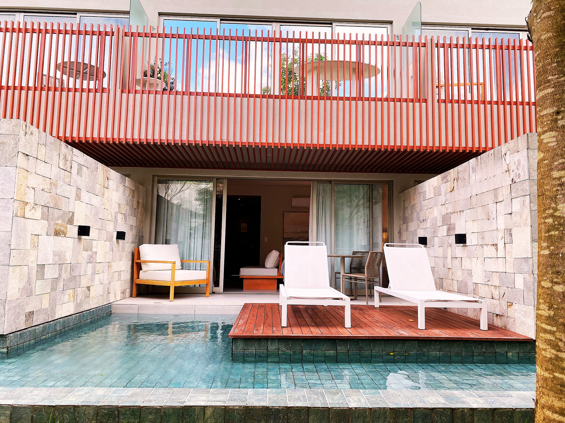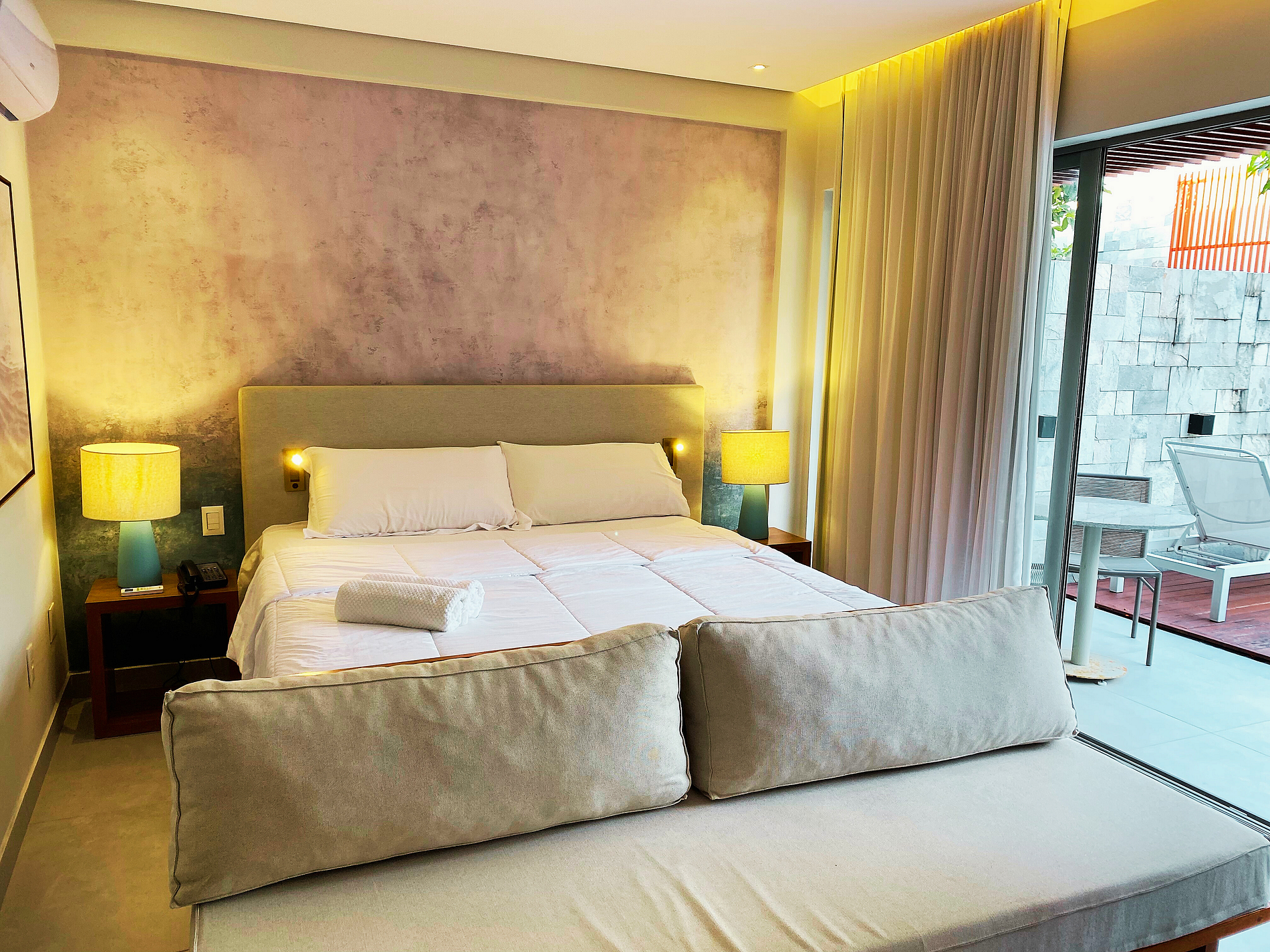 Gostamos particularmente da localização, beleza e conforto do flat. A área da piscina é linda, o restaurante ótimo, comemos vários dias lá, pois achávamos a relação custo benefício muito boa. E lá eu tinha certeza de que era limpo e bem feita a comida. O atendimento do gerente Léo, da chefe de cozinha Priscila e sua equipe é primoroso. Não sabem o que fazer para lhe dar conforto e atendimento de primeira. Tomamos o ótimo café da manhã la, que custa 75 reais, e dá direito a um lanche à tarde. Vale a pena. O quarto é grande, o banheiro enorme. Cama confortável. Tem lugar para quatro pessoas, pois tem um sofá e uma cama extra. Como somos um casal, não usamos. A área da varanda é bem bonita, mas não é uma piscina externa privativa. É mais uma área rodeada por água bem rasa, mas que traz um sensação de beleza e conforto. Tivemos um problema no ar condicionado que foi resolvido rapidamente pela Almare, administrador do flat.