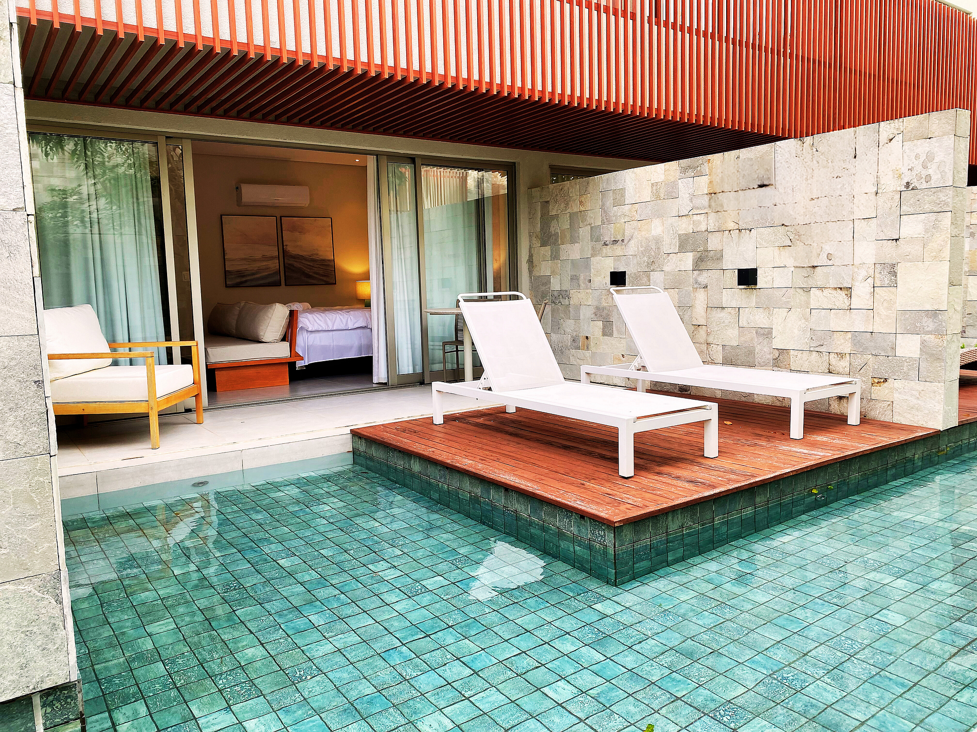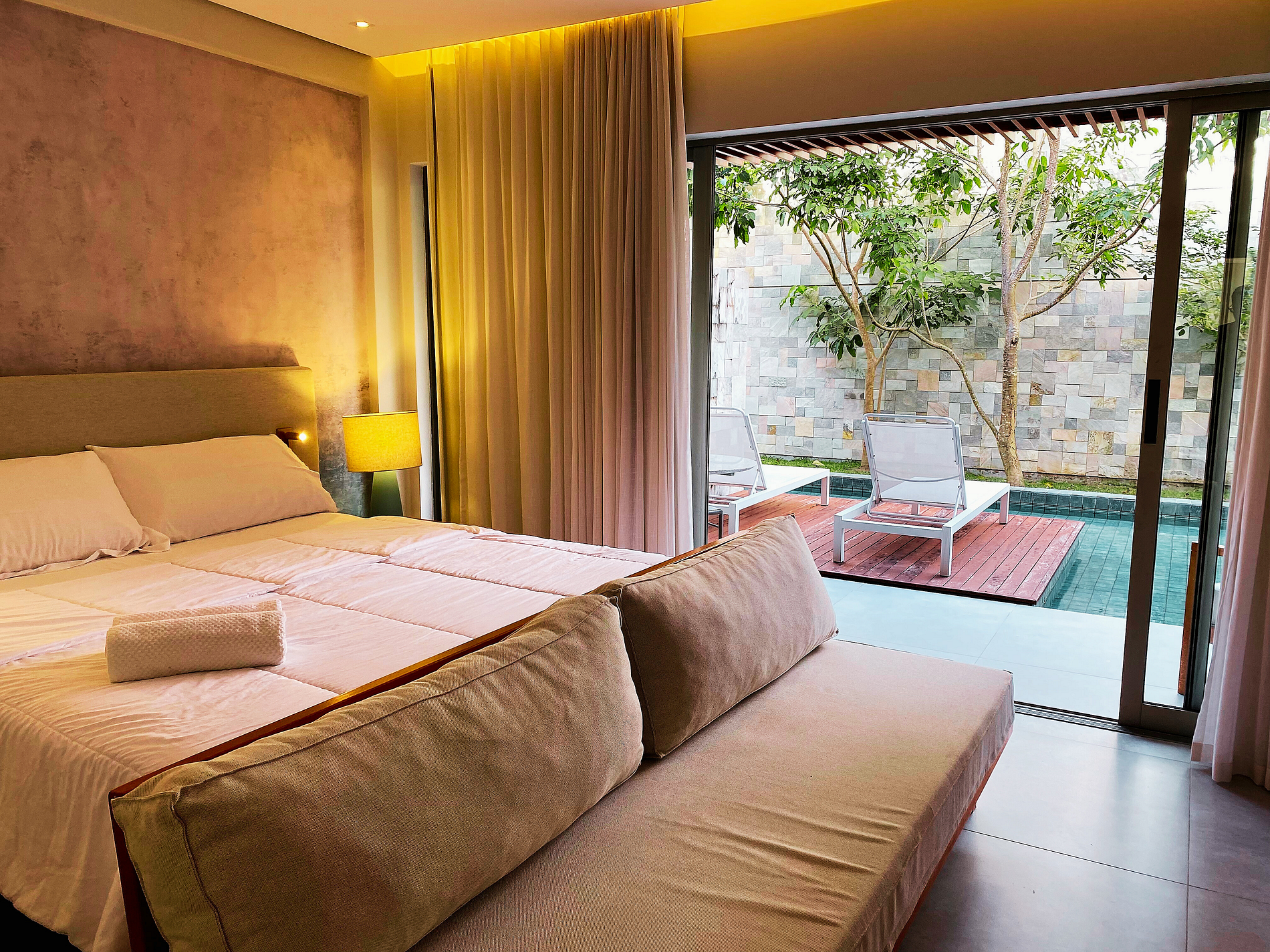 A Île de Pipa oferece acomodações de alto padrão que combinam o conforto moderno com o charme rústico. Os quartos e suítes são projetados para proporcionar o máximo de relaxamento, e muitos deles oferecem vistas deslumbrantes para a piscina.