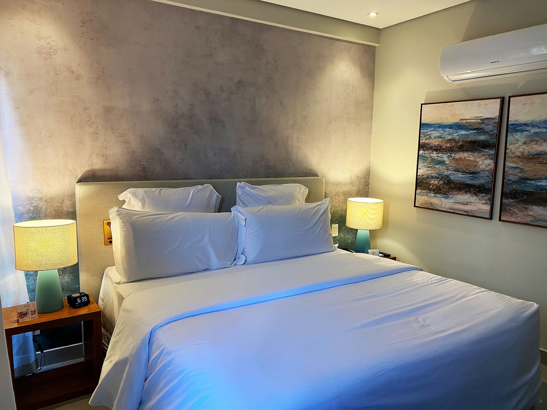 Resort impecável. Uma jóia bem no centro de Pipa. No início da rua principal. Acesso fácil, check in rápido (conforme as instruções enviadas pela equipe Almare), estacionamento no subsolo amplo e seguro. Restaurante lindo e o café da manhã foi dos melhores que já tomei em resorts (ao custo de 69,90/pessoa). Academia pequena. Mas com os equipamentos básicos necessários. Piscina ampla e bem cuidada! Bar da piscina muito bom. Staff bastante atencioso. Quarto exatamente como o descrito nas fotos. Limpo e cheiroso! Cama king com colchão confortável e enxoval de qualidade. Condicionador de ar novo e potente. Cozinha equipada com frigobar e cafeteira Nespresso. Alguns ítens básicos de uso (talheres, copos, taças, pratos). Roupeiro amplo. Banheiro enorme equipado com ducha e misturador (água fria/ quente). Cereja do bolo: quarto localizado no fim de um corredor, distante do fuzuê da área da piscina, propiciando privacidade e paz aos hóspedes. Super recomendo o flat!