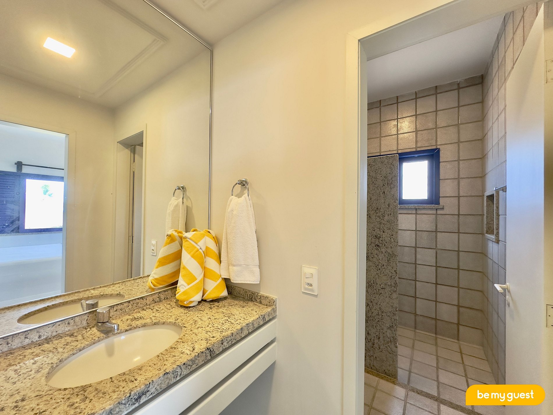 – Suíte 3: cama queen size, ar condicionado, banheiro e armário.