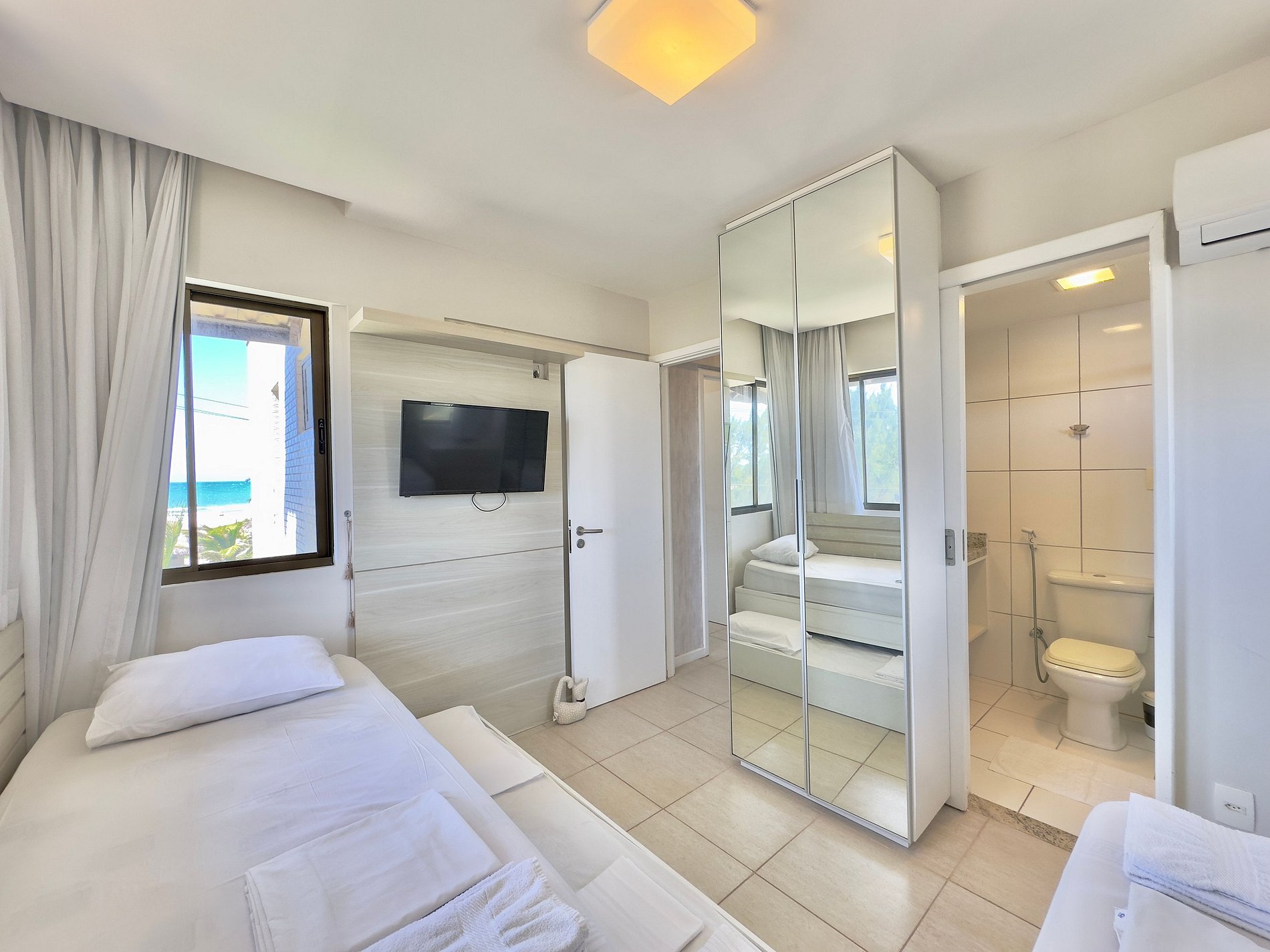 Essa cobertura maravilhosa, tem três suítes! Uma com uma cama para o casal e duas com duas camas de solteiro, todas com ar condicionado e vista para o mar. Ou seja, dá pra aproveitar com todo mundo!