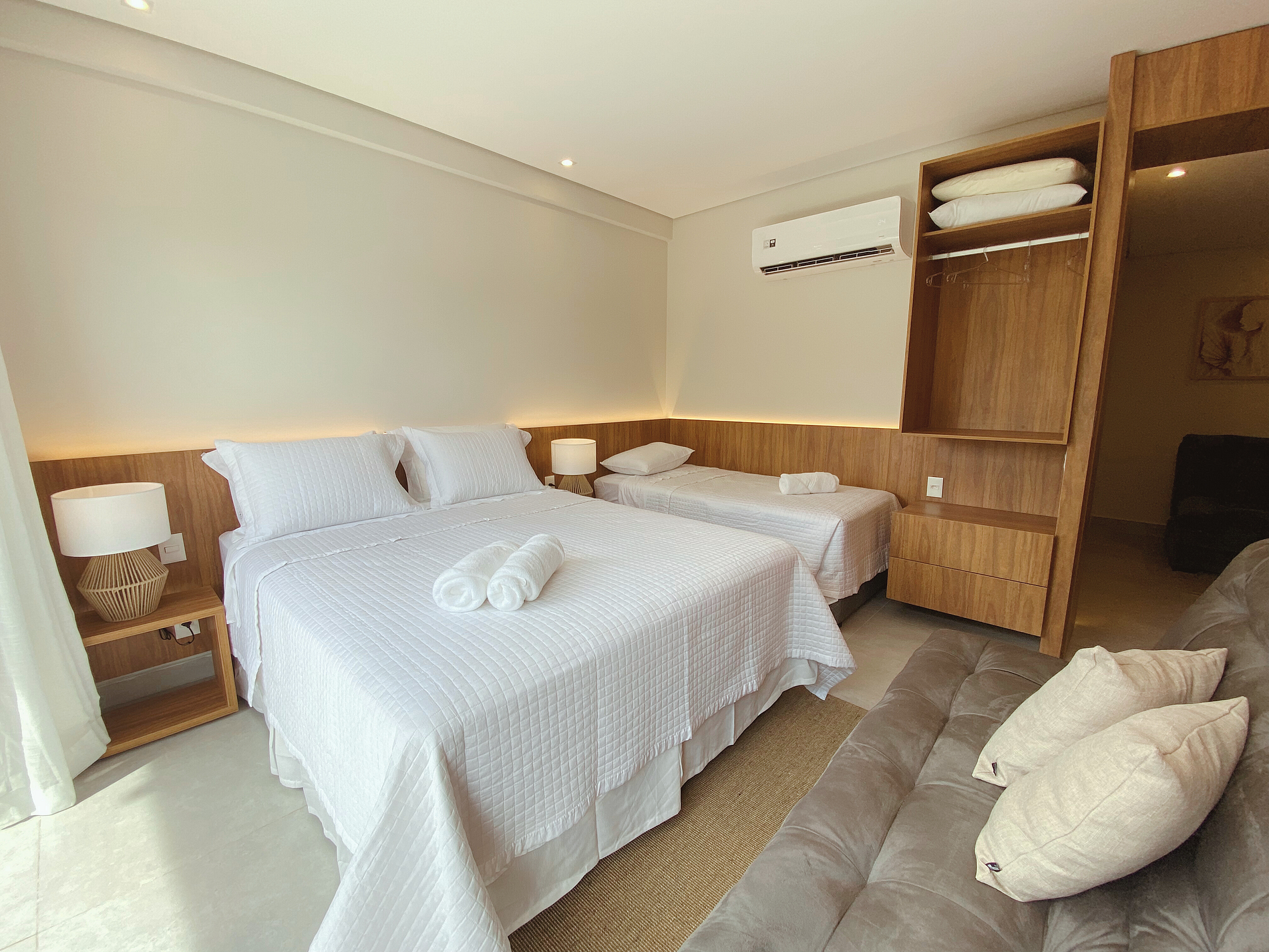 O flat é tão bem montado e mobiliado, que parece estar em um hotel. Já estive em outra oportunidade no Ilê, em um flat com a mesma planta. (Via QAVI - Quarto à Vista). A experiência por essa opção do Almare Flats, foi infinitamente superior. Enxoval completo de toalhas, roupa de cama com travesseiros sobrando, balinhas e souvenirs nos banheiros.