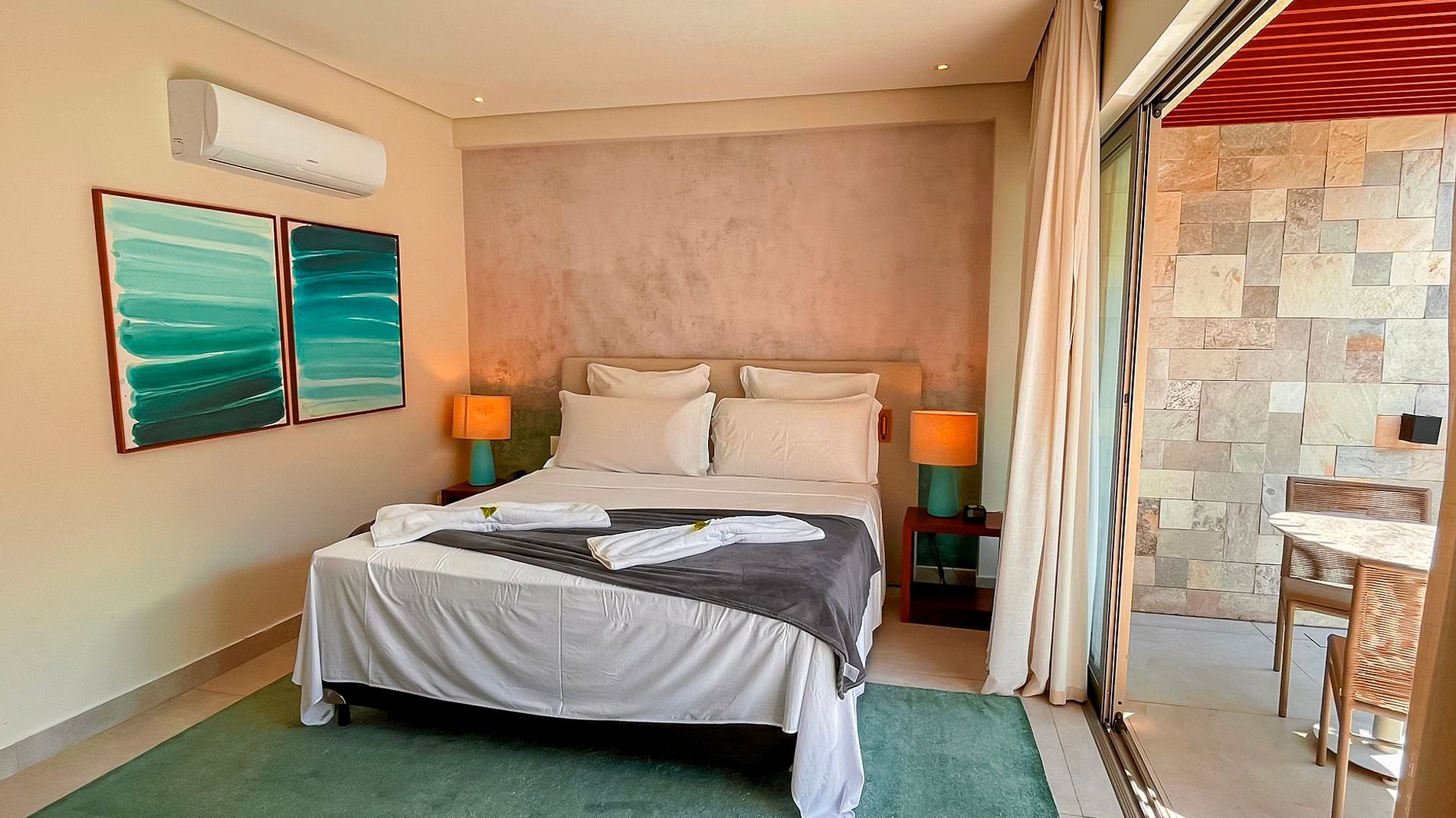 A Île de Pipa oferece acomodações de alto padrão que combinam o conforto moderno com o charme rústico. Os quartos e suítes são projetados para proporcionar o máximo de relaxamento, e muitos deles oferecem vistas deslumbrantes para a piscina.