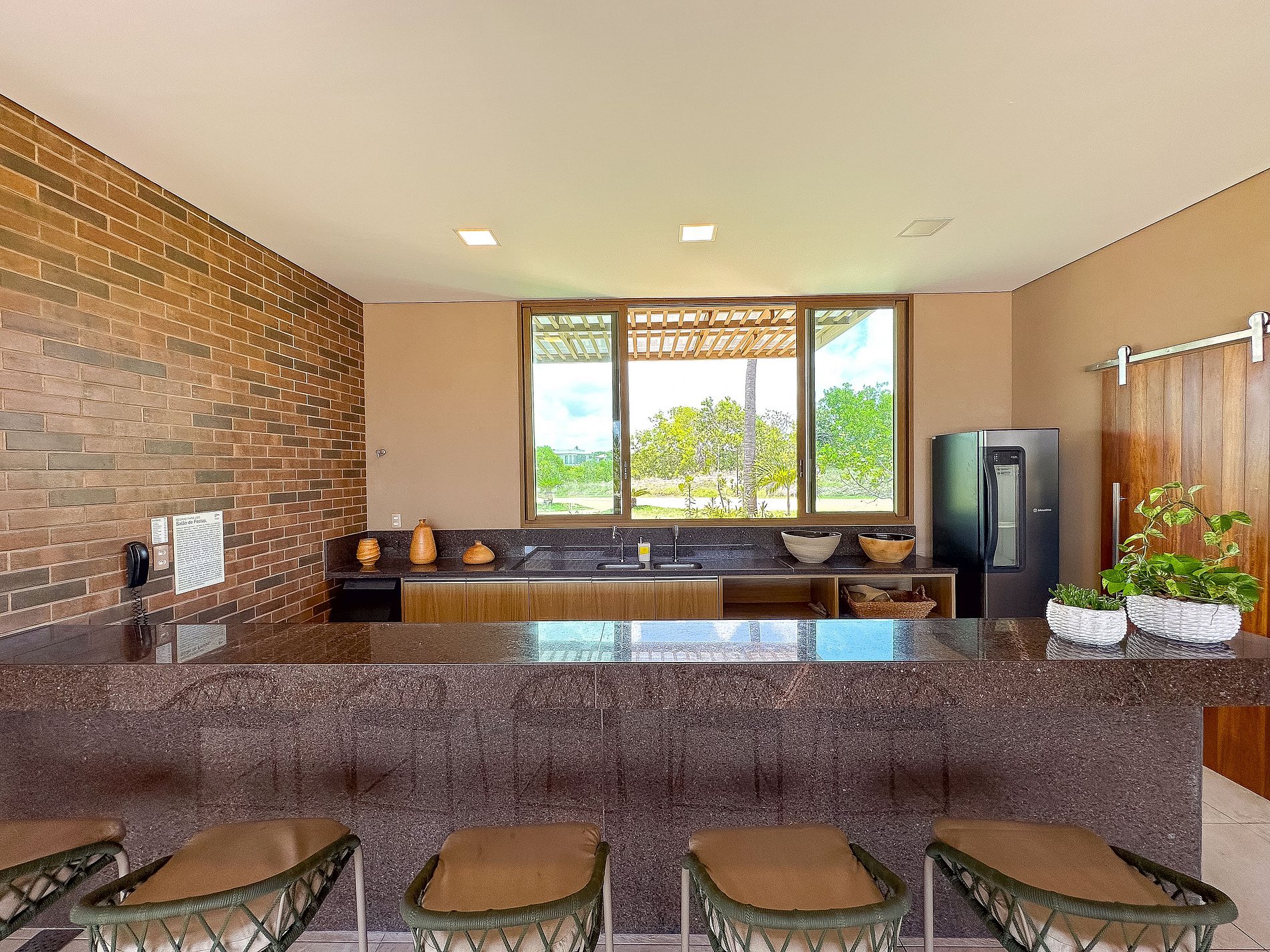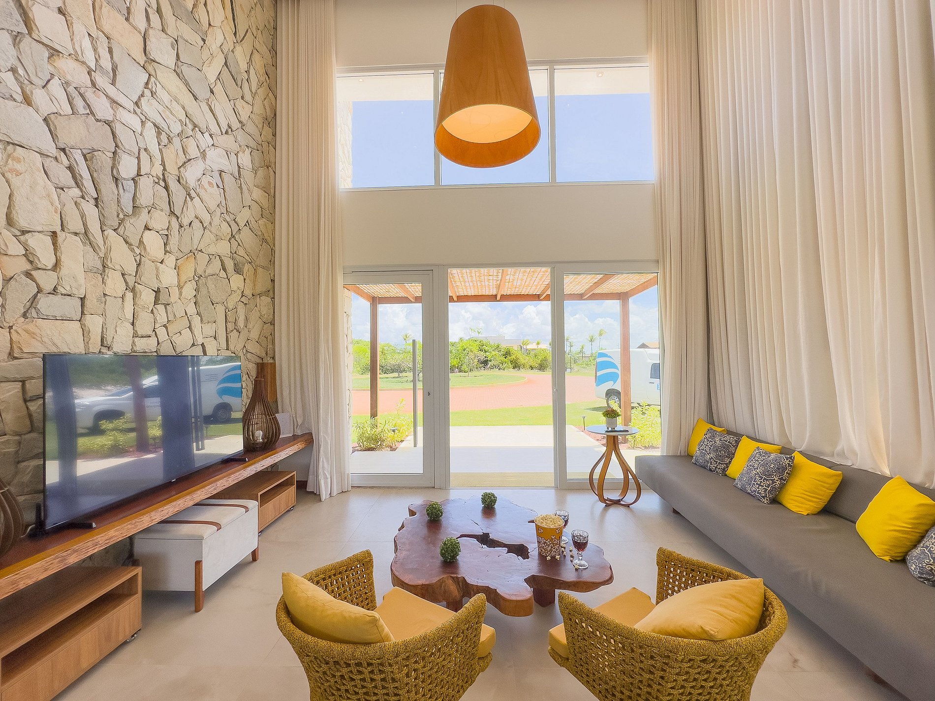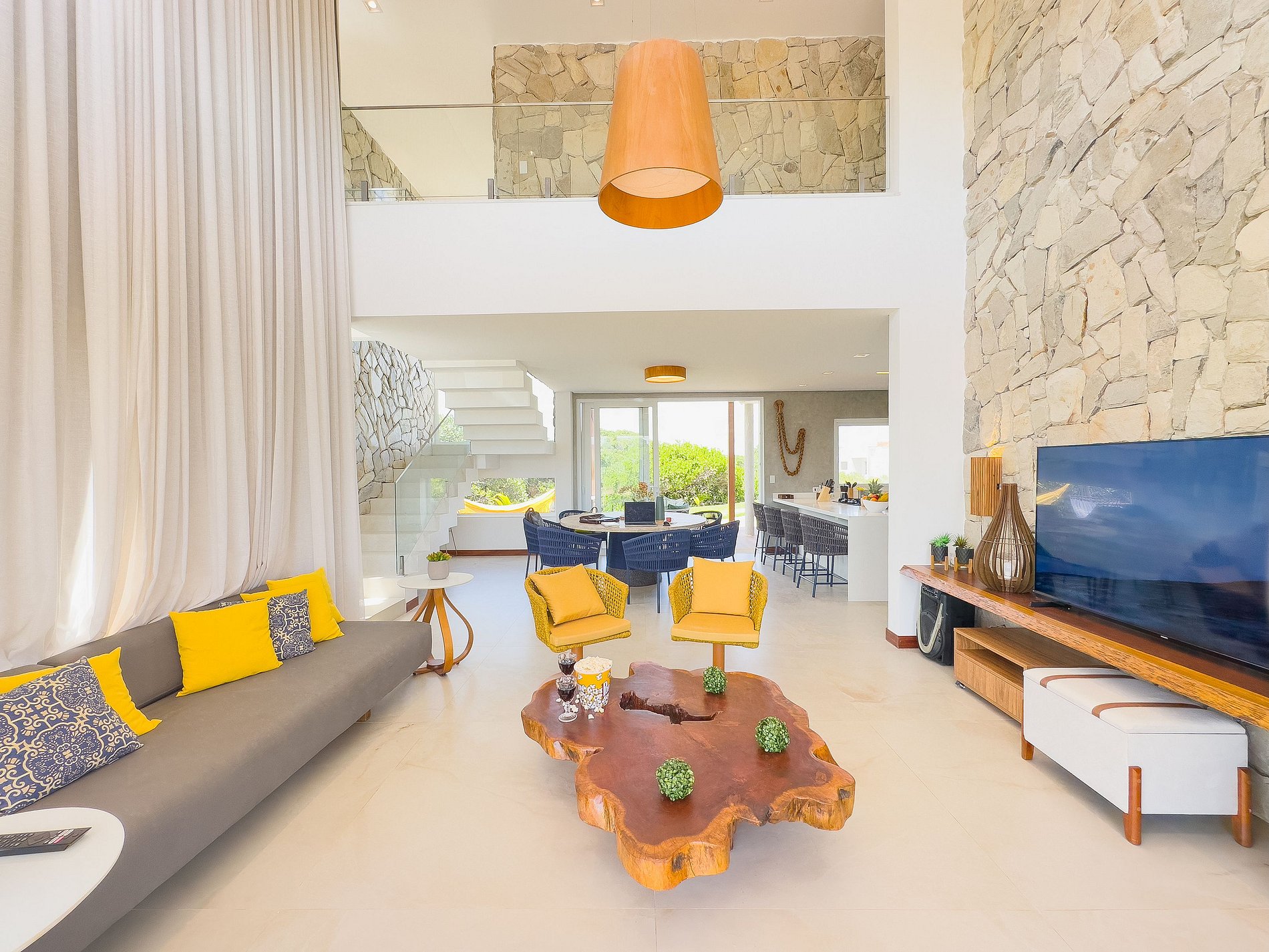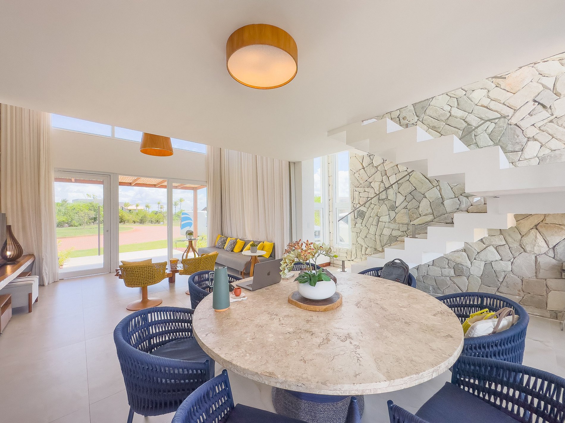 Amplos espaços de convivência, incluindo salas de estar e jantar