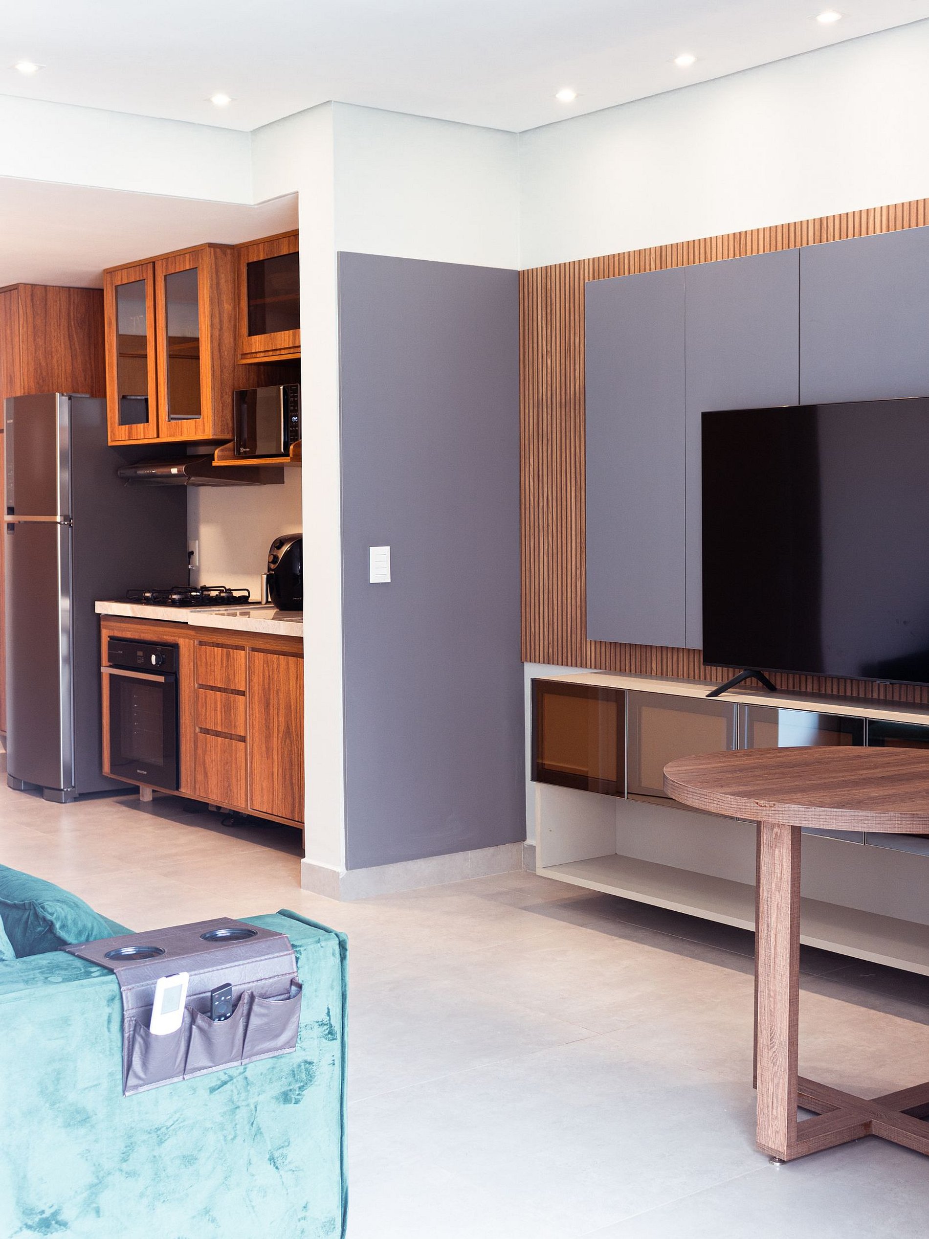 A área de estar é decorada com bom gosto, oferecendo um espaço convidativo para relaxar e socializar. A cozinha é totalmente equipada com um moderno cooktop, utensílios de alta qualidade e uma prática air fryer, proporcionando a praticidade necessária para preparar refeições deliciosas.