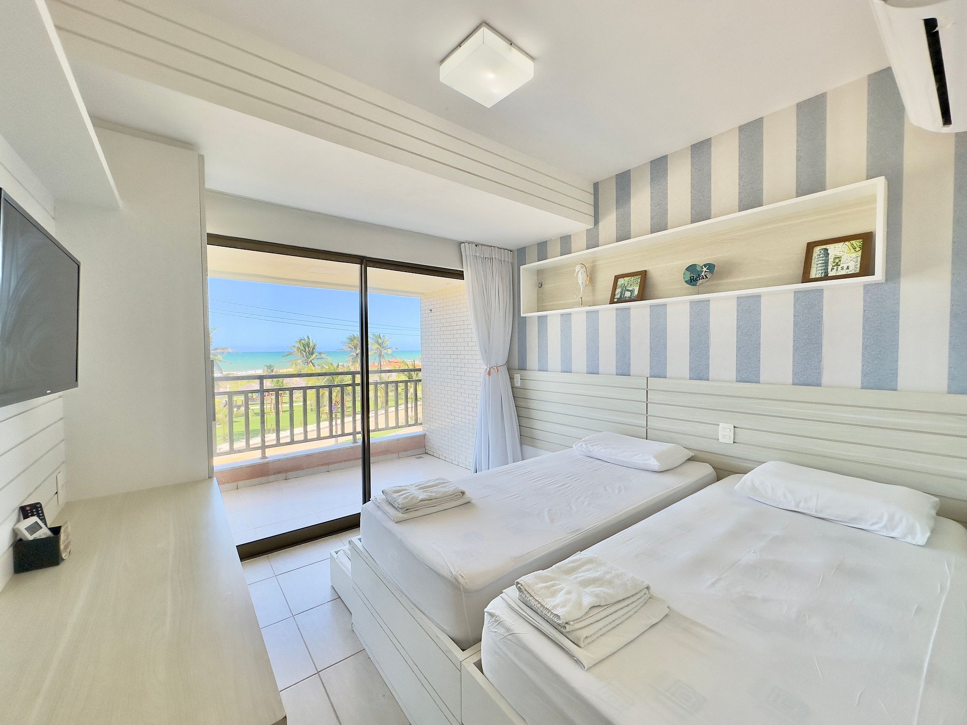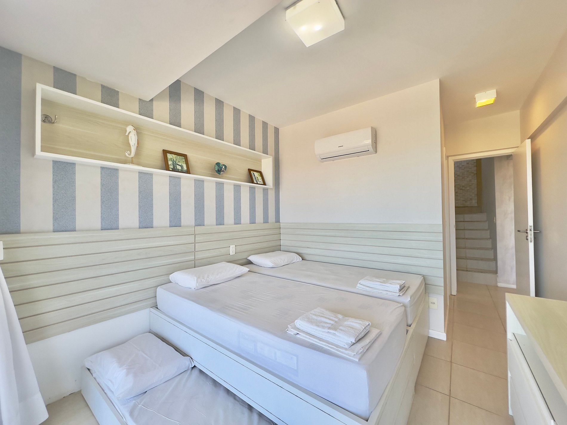 Essa cobertura maravilhosa, tem três suítes! Uma com uma cama para o casal e duas com duas camas de solteiro, todas com ar condicionado e vista para o mar. Ou seja, dá pra aproveitar com todo mundo!