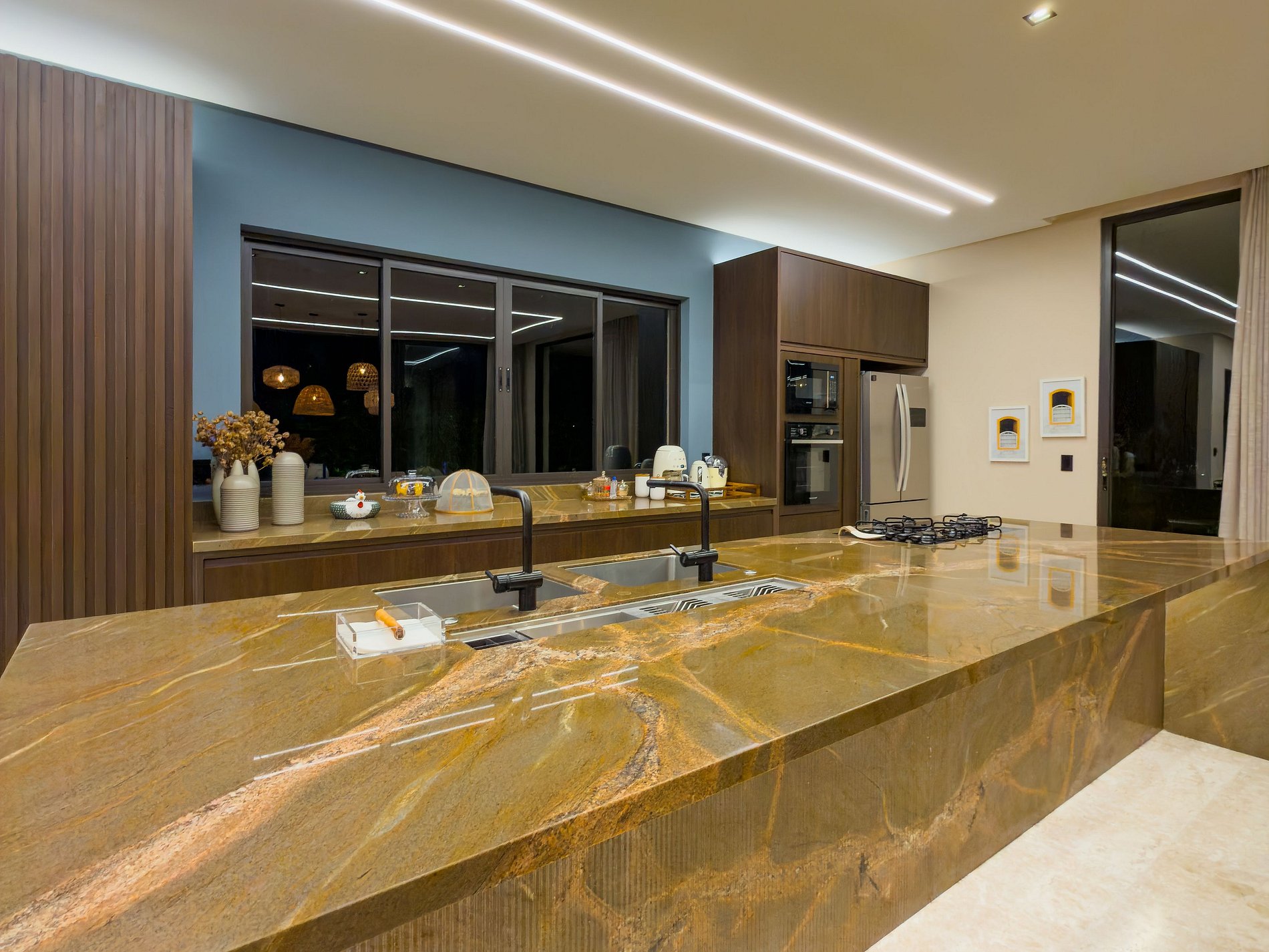 A arquitetura leve e a decoração sofisticada traduzem uma elegância serena, sem excessos. Já a área externa é um convite ao prazer: piscina com deck seco e molhado, espreguiçadeiras ao sol, jardim sombreado pelo canto dos pássaros, churrasqueira e espaços integrados que unem todos ao redor da alegria de estar junto.